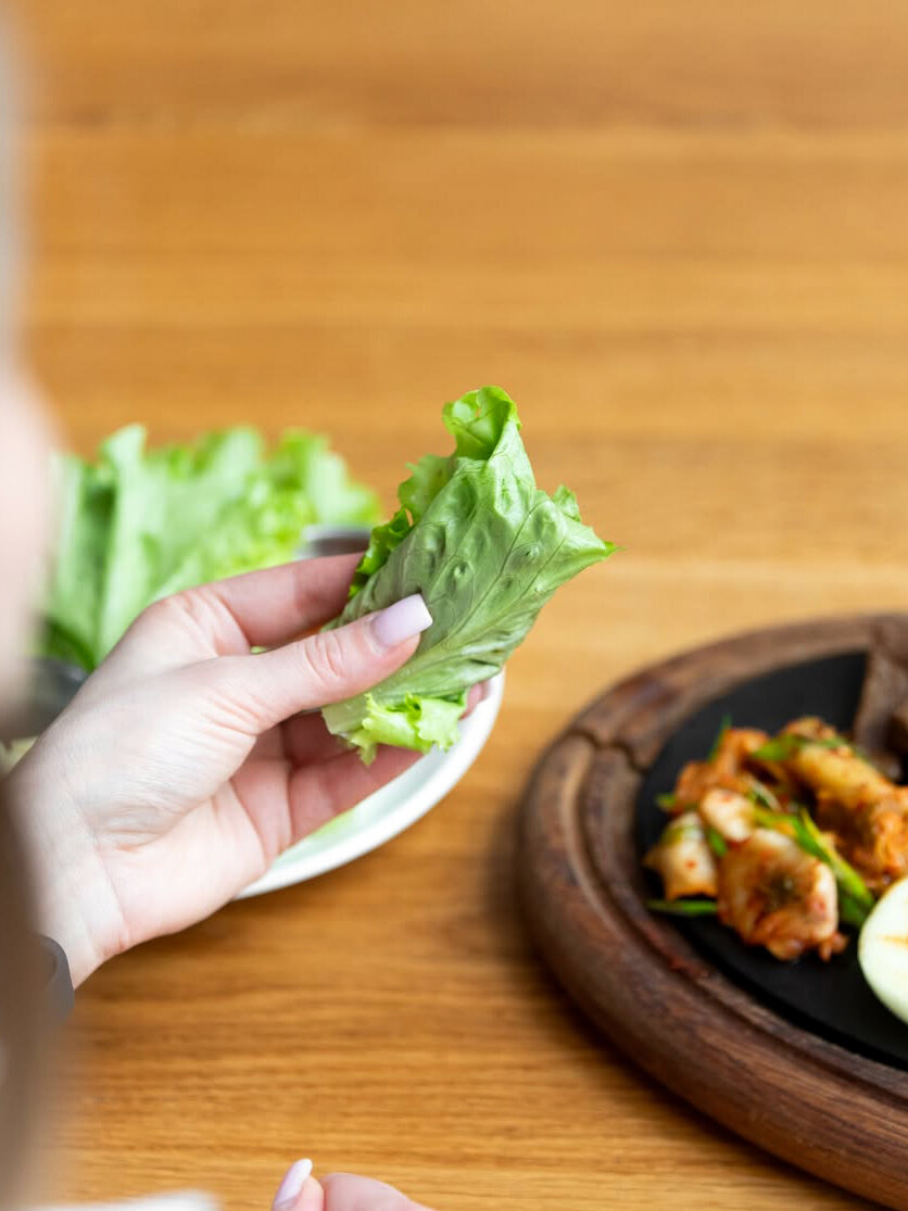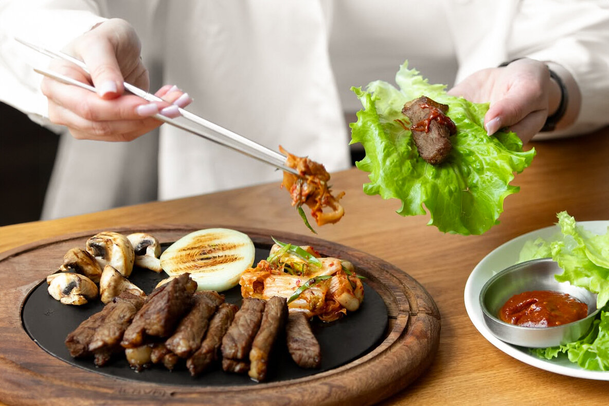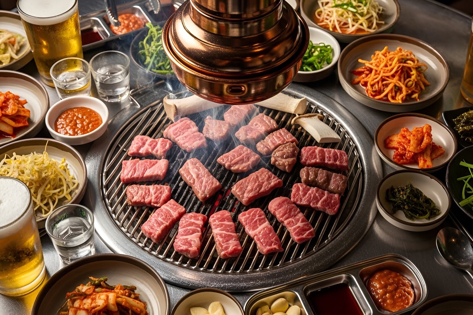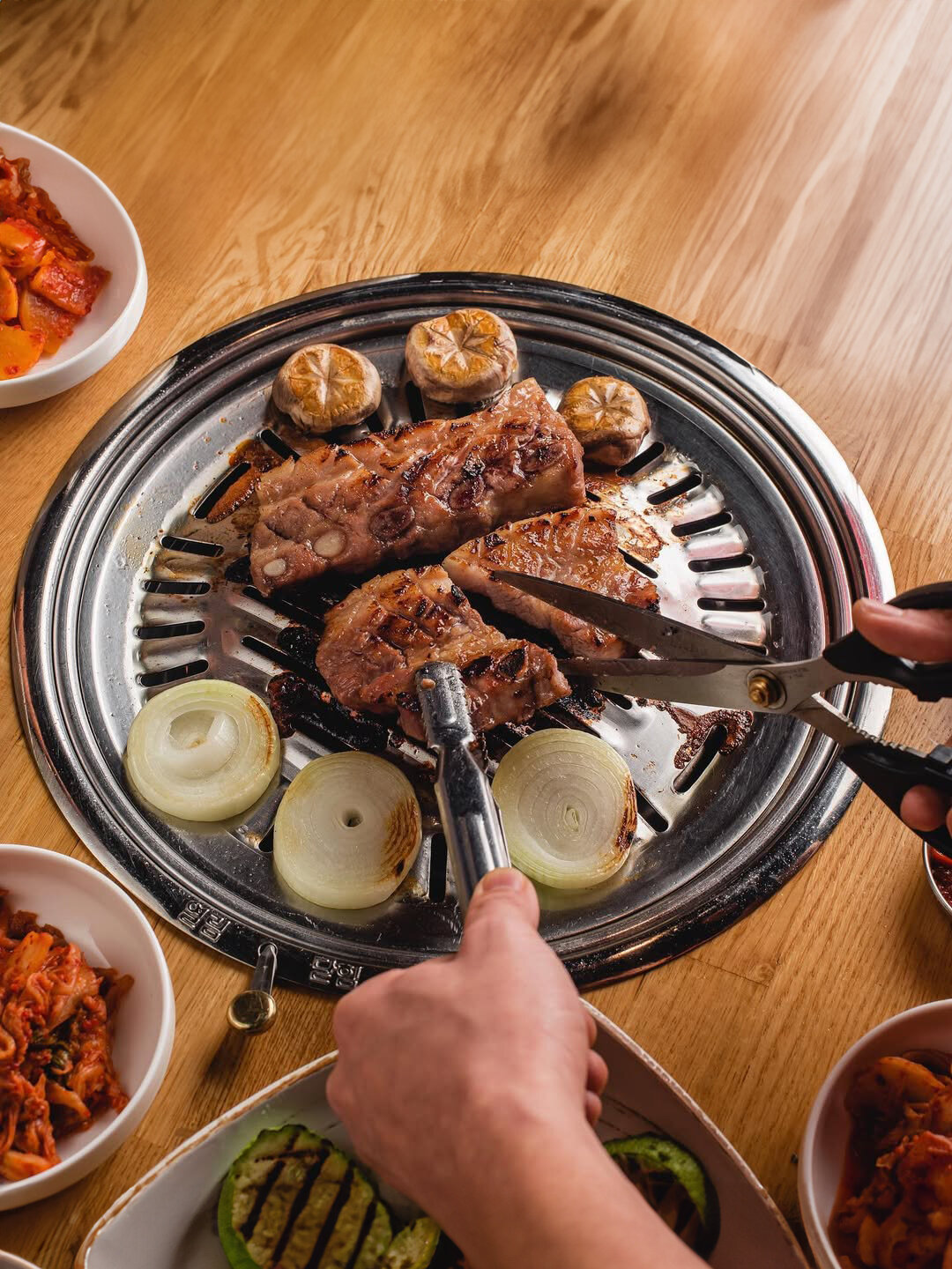 Традиция собраться за грилем, встроенным в стол, появилась из древних кочевых практик. Простой по происхождению способ готовить на огне стал частью культуры на волне экономического бума в Южной Корее: доступность свинины и говядины превратила барбекю из редкого праздничного блюда в популярный социальный ритуал. В центре стола устанавливают жаровню с углями или электрическую плитку. Гости сами жарят на решётке тонко нарезанное мясо: классическую говядину бульгоги, маринованную в соевом соусе, или свиную грудинку самгёпсаль. Тут же готовят лук-порей и грибы. Приготовленные кусочки принято заворачивать в листья салата или кунжута (похожи на шисо), наполняя их разнообразием закусок панчхан.