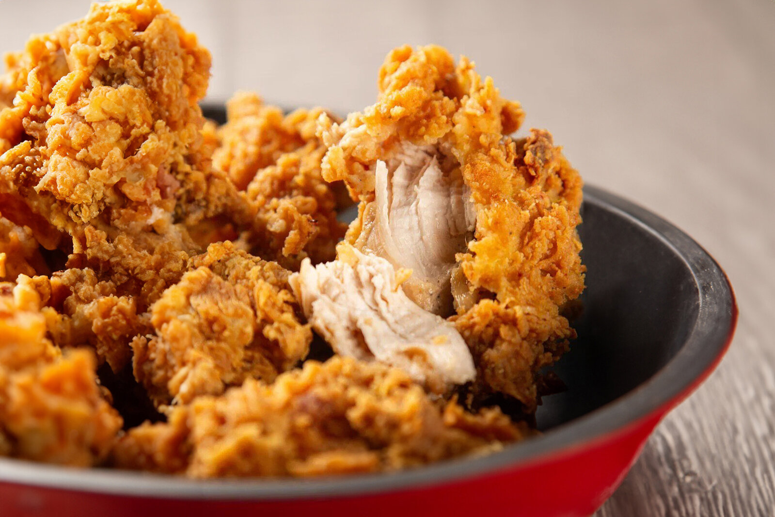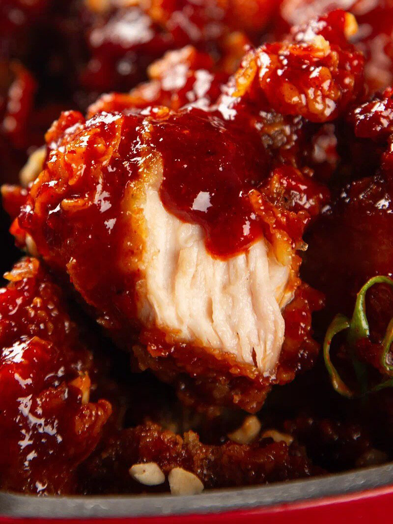 Из 9000 человек, живущих в 18 крупных городах по всему миру, 16,5% назвали жареную курочку любимой корейской едой. Лёгкая, стекловидная и пузырчатая корочка, которая остаётся хрустящей ещё долго после приготовления, получается благодаря рисовой муке и/или картофельному крахмалу в составе кляра. Ледяная вода или даже газировка делают текстуру ещё более воздушной.