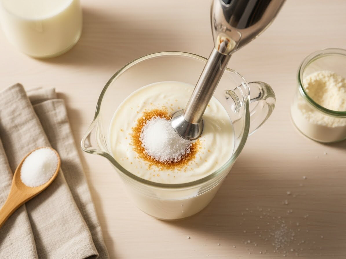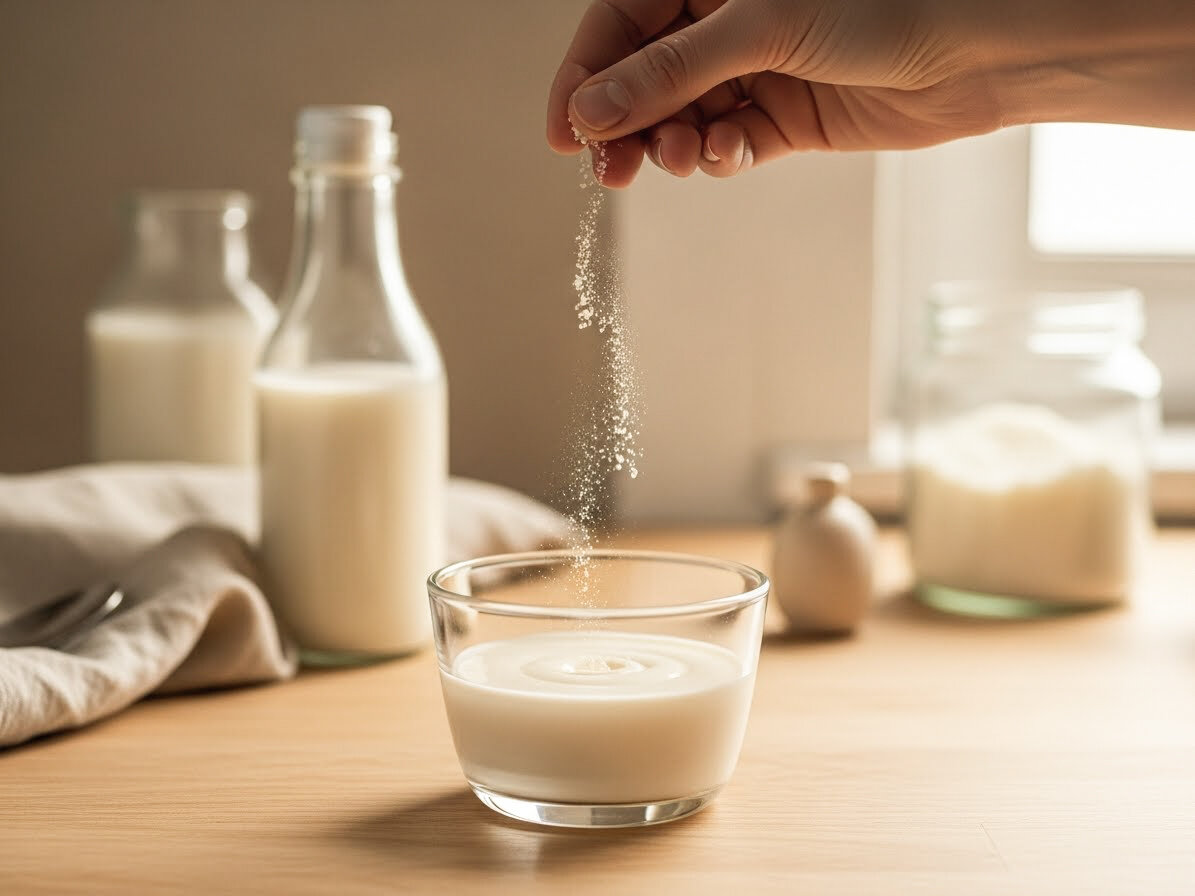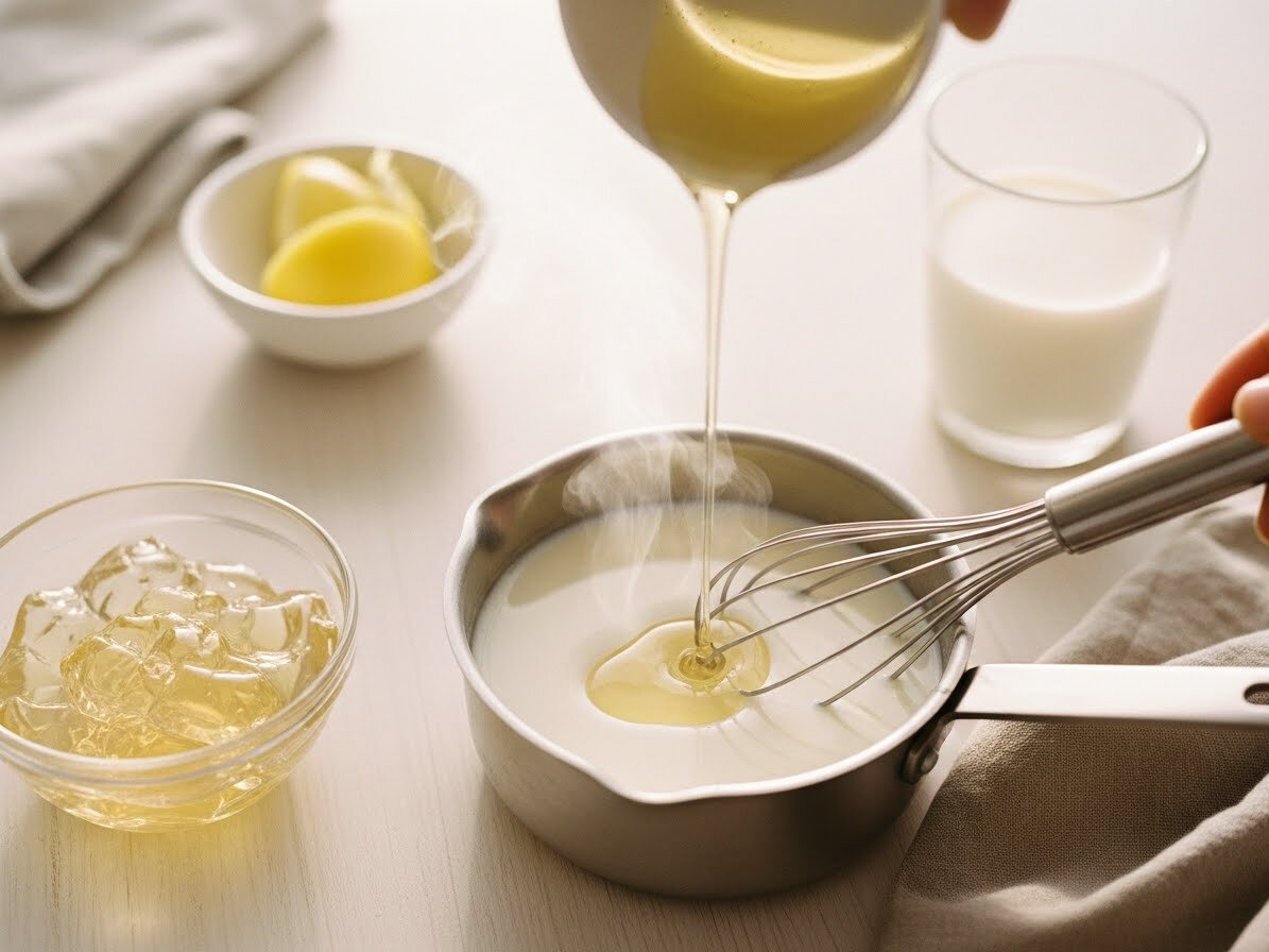 При работе с молочными и кислыми основами правила активации остаются прежними, но добавляются нюансы. При соединении с основой тщательно перемешивайте, чтобы избежать комков, иначе массу придётся процеживать. Желатин можно замачивать непосредственно в молоке на 15–30 минут. Далее масса растворяется в тёплой молочной основе. Молоко не препятствует, а напротив, помогает быстрой стабилизации. Продукты, содержащие большое количество кислоты, ухудшают желирующие свойства желатина, поэтому в сочетании с уксусом или лимоном вещество может попросту не сработать.