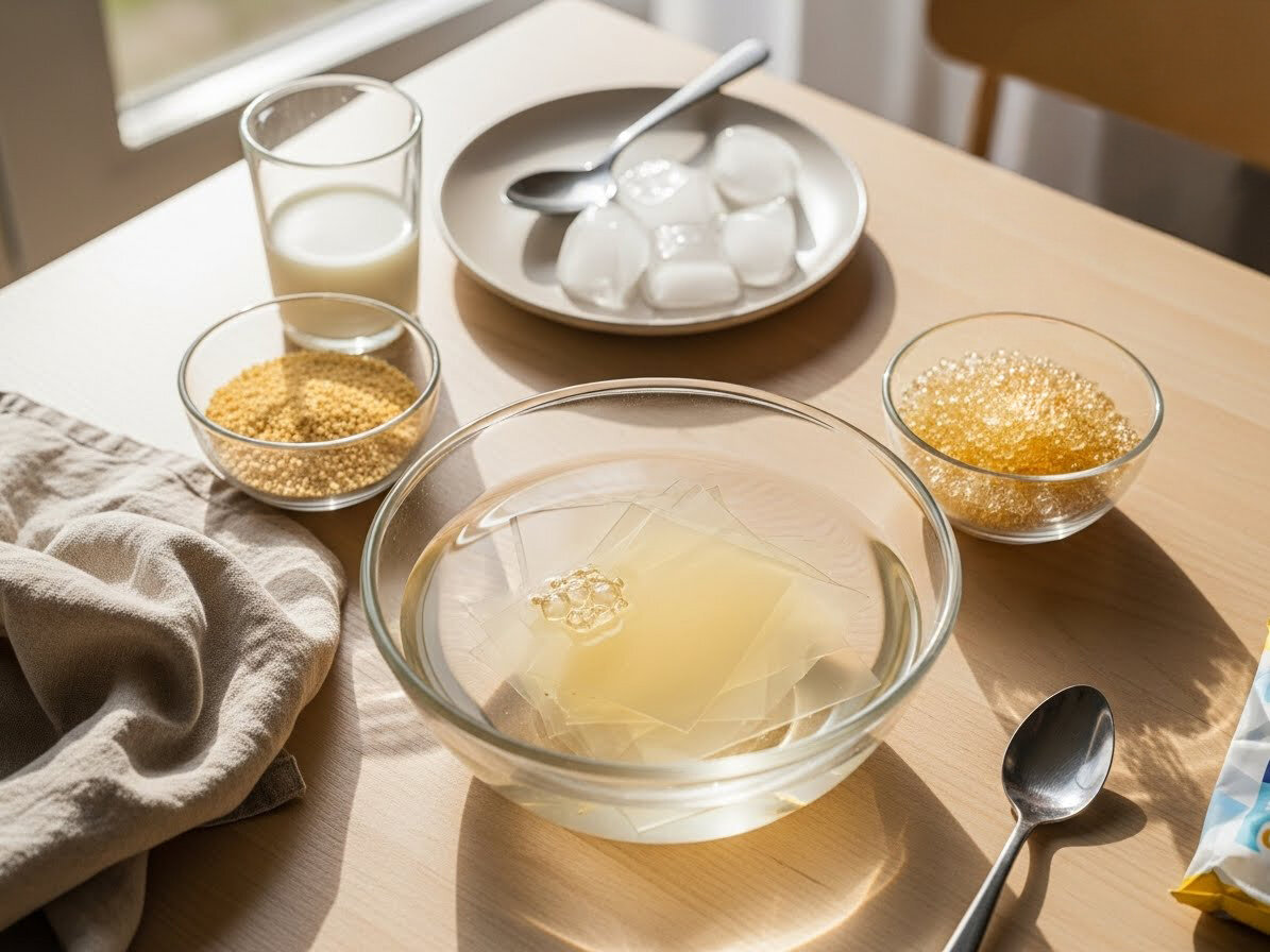 В процессе производства желатина происходит дегидратация; чтобы активировать продукт для приготовления блюд, его нужно предварительно подготовить — замочить, растворить (распустить) и добавить в основную массу.