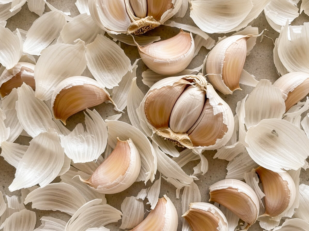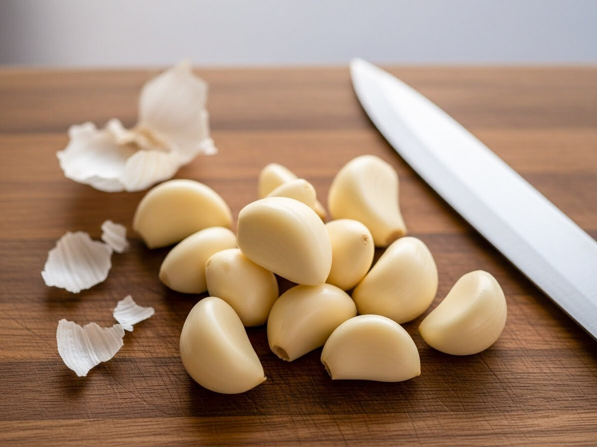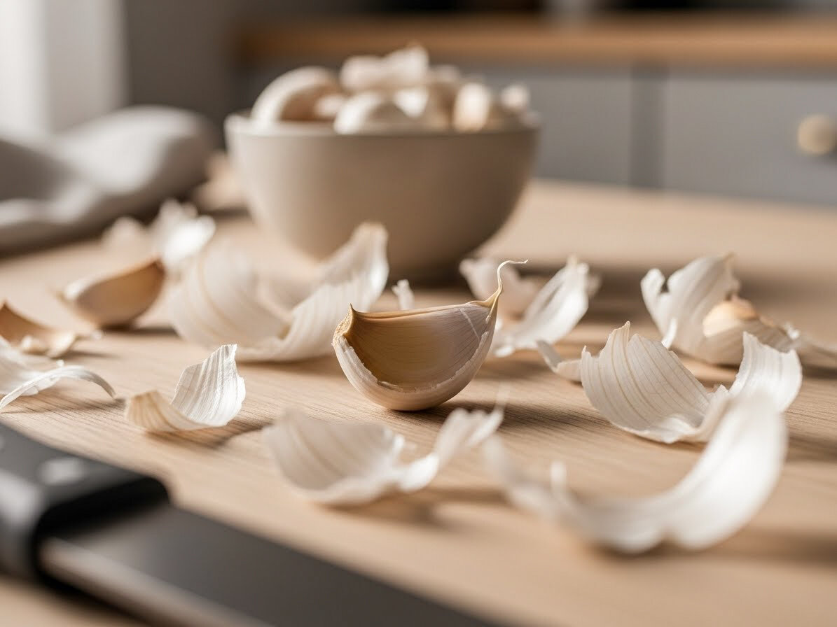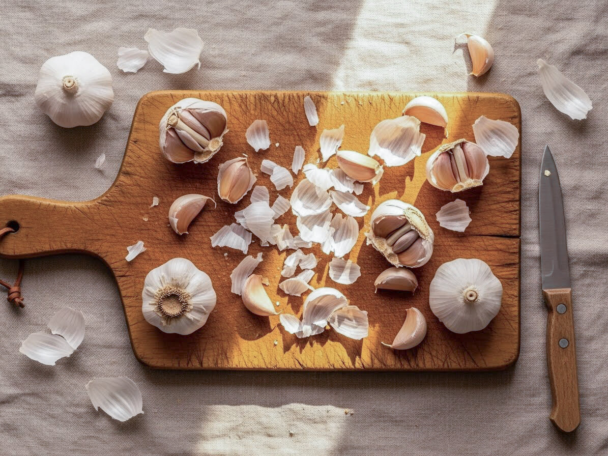 Этот метод спасает и со свежим, и с сухим чесноком. Возьмите обычный силиконовый коврик. Разложите дольки на одной его половине, накройте второй и прокатайте ладонью, как будто месите тесто. Пару энергичных движений — и готово! Идеально для тех, кому нужно быстро почистить полкило чеснока для закаток или жаркого!