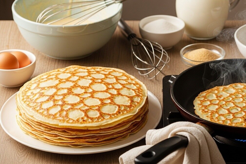 Мгновенные кружевные блинчики с дырочками покоряют тонкостью и нежностью. Идеальный холст для сладких и солёных начинок — от творога до красной икры.