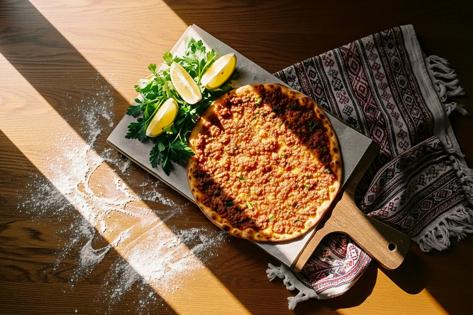 Лахмаджун по-турецки Тонкие хрустящие лепёшки с сочной мясной начинкой — уличная еда Стамбула, где рубленое мясо и овощи томятся в пряных томатных соусах. Подаётся с лимоном и зеленью для свежести.