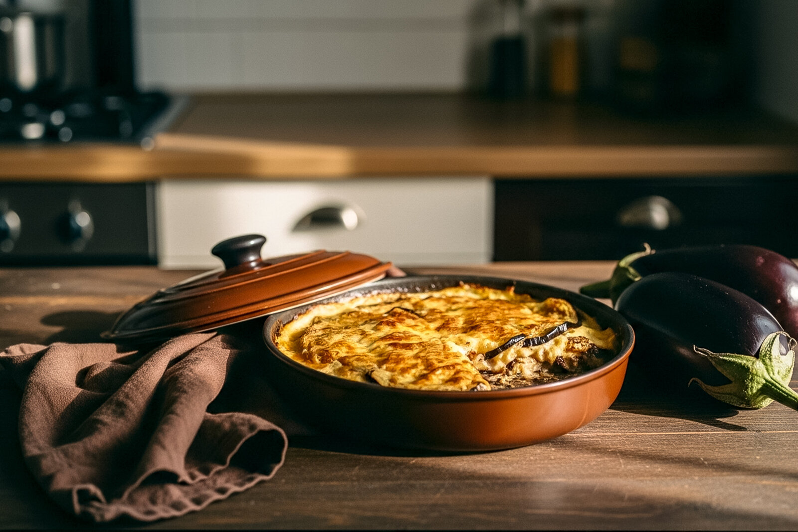 Собрать слои: картофель → баклажаны → мясной соус → бешамель.