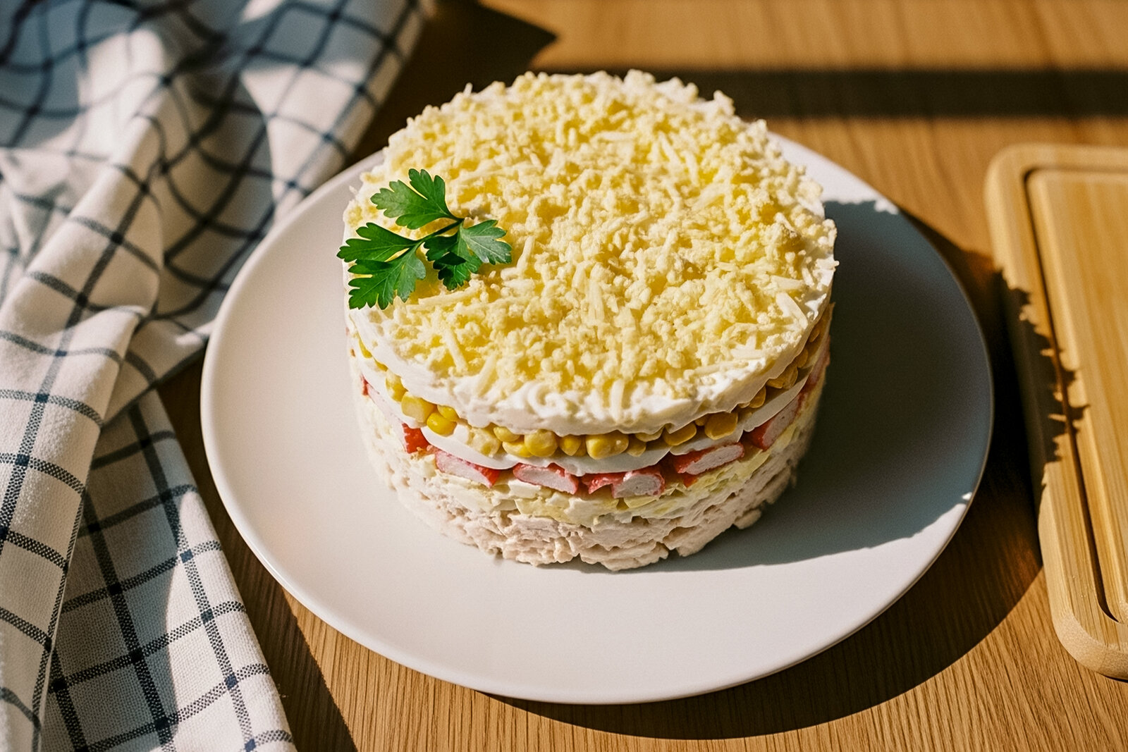 Отжать консервированную кукурузу от маринада, выложить на крабовые палочки, смазать майонезом.