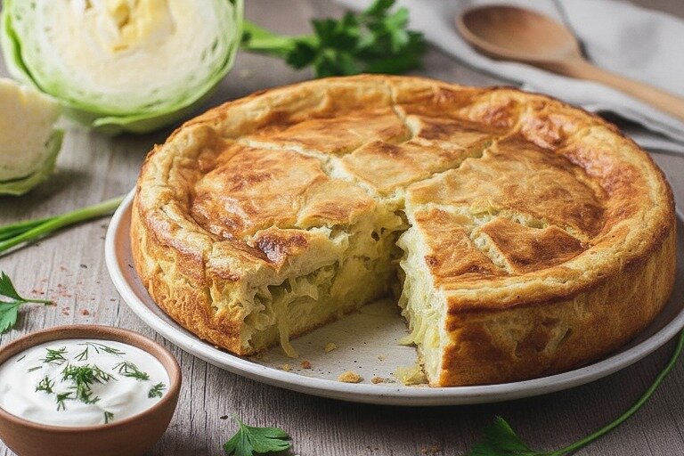 Заливной пирог с капустой Ленивая выпечка для тех, кто ценит время: хрустящая капуста в облаке сметанного теста с золотистой корочкой. Аромат тушёного лука и свежей зелени превращает простые ингредиенты в уютный ужин.