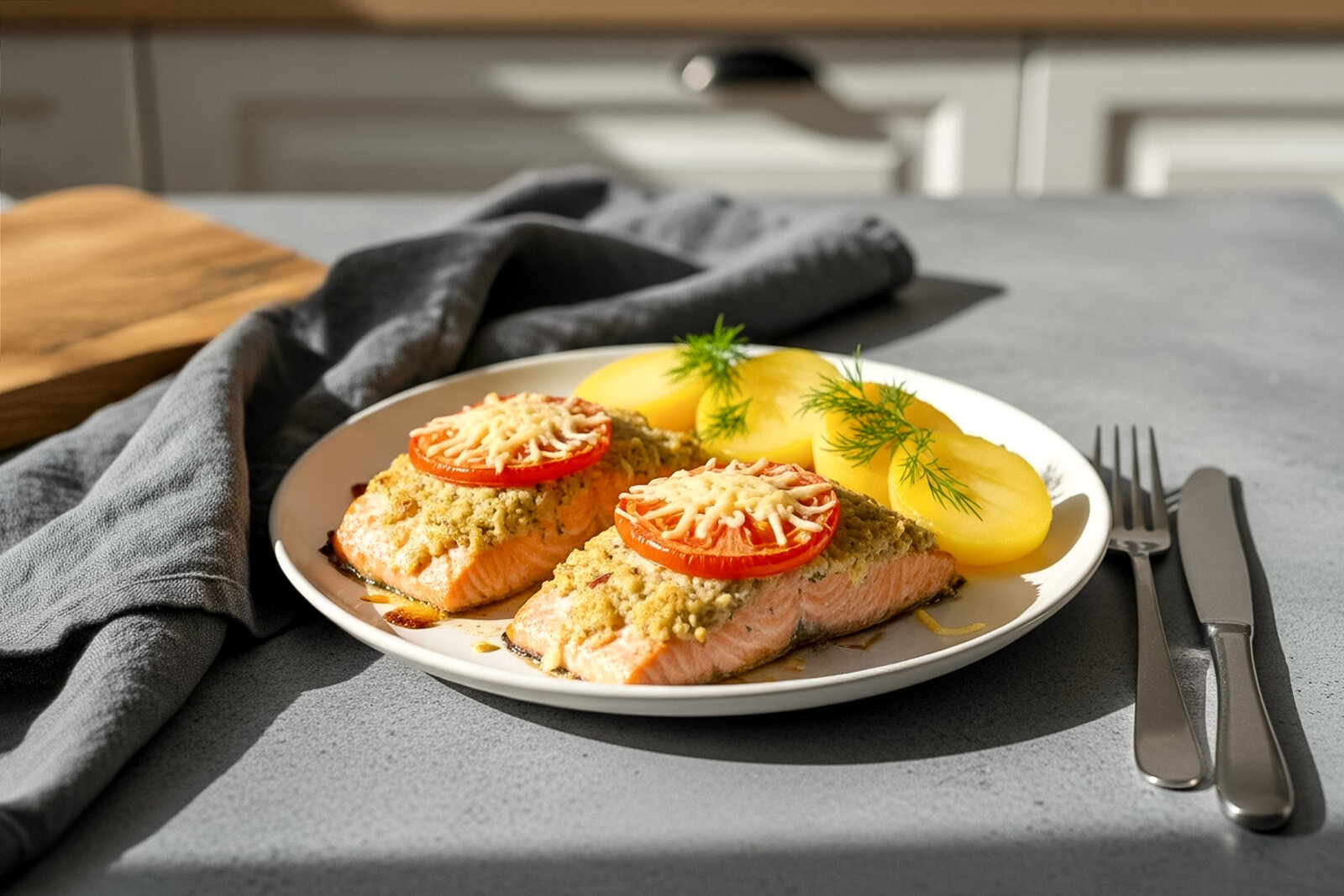 На приготовление запечённой кеты под сырной корочкой с картофелем потребуется 35 минут.