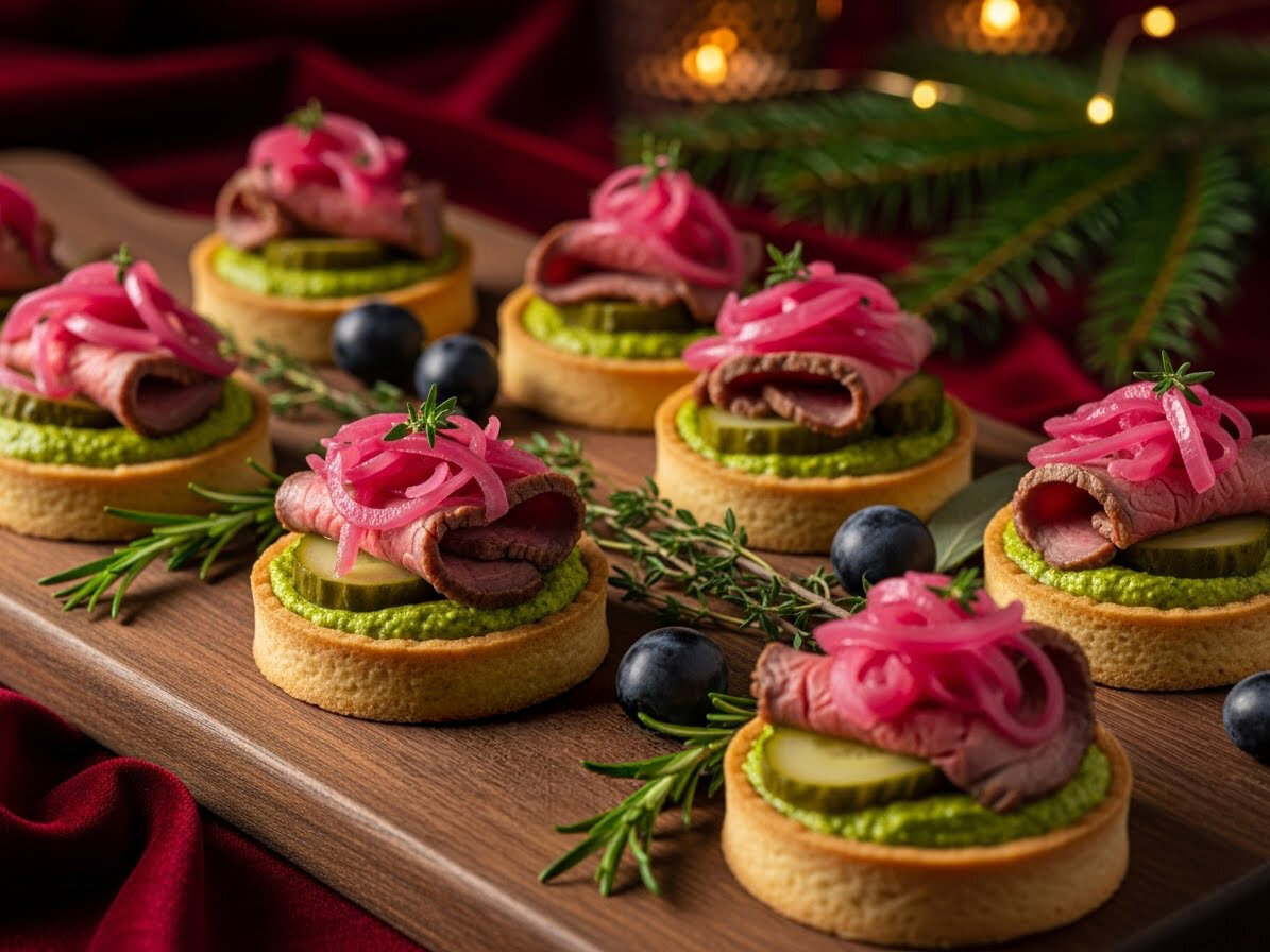 Выложить в тарталетки: песто (по чайной ложке в каждую тарталетку), кружок солёного огурца, слайс ростбифа, маринованный лук.