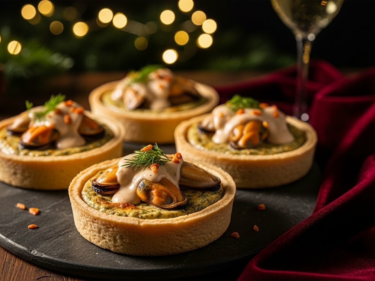 Аккуратно выложить мидии в соусе поверх сырного слоя. Украсить тарталетки веточкой укропа или кинзы.