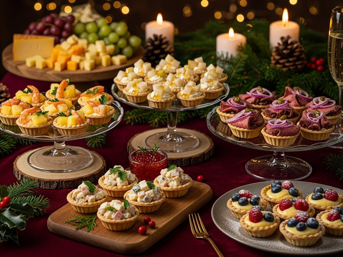 — Располагать на нижнем ярусе насыщенные закуски (с лососем, паштетом), на верхнем — лёгкие или сладкие варианты (ягодные, сырные).