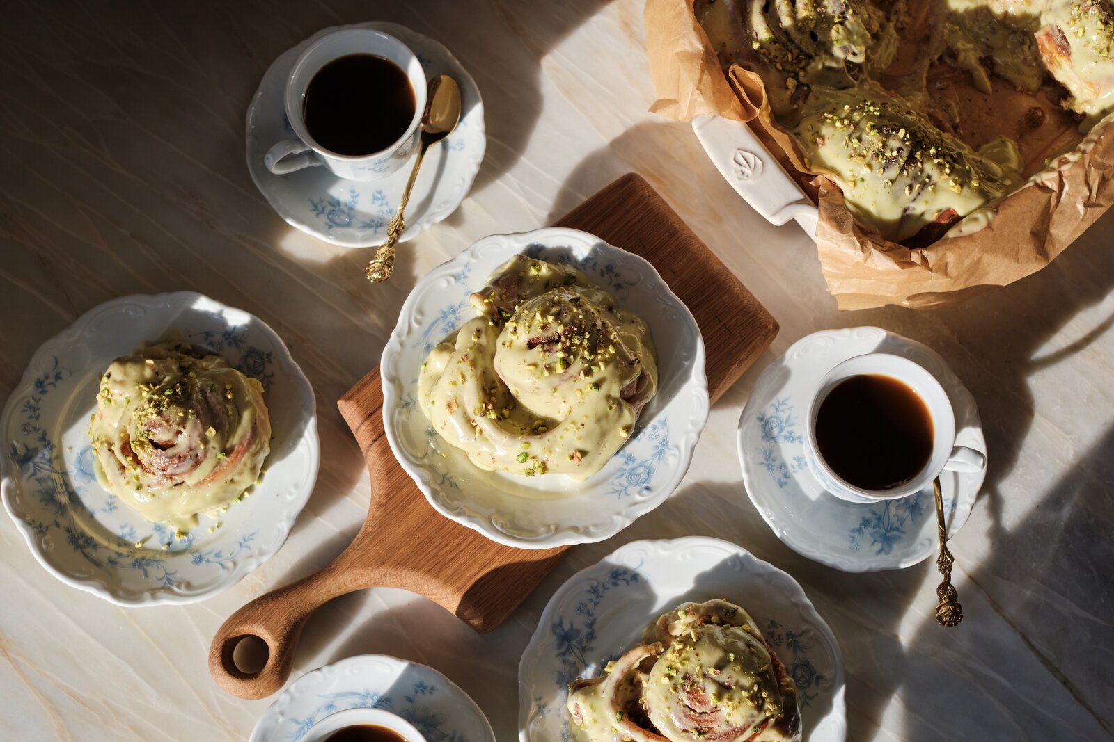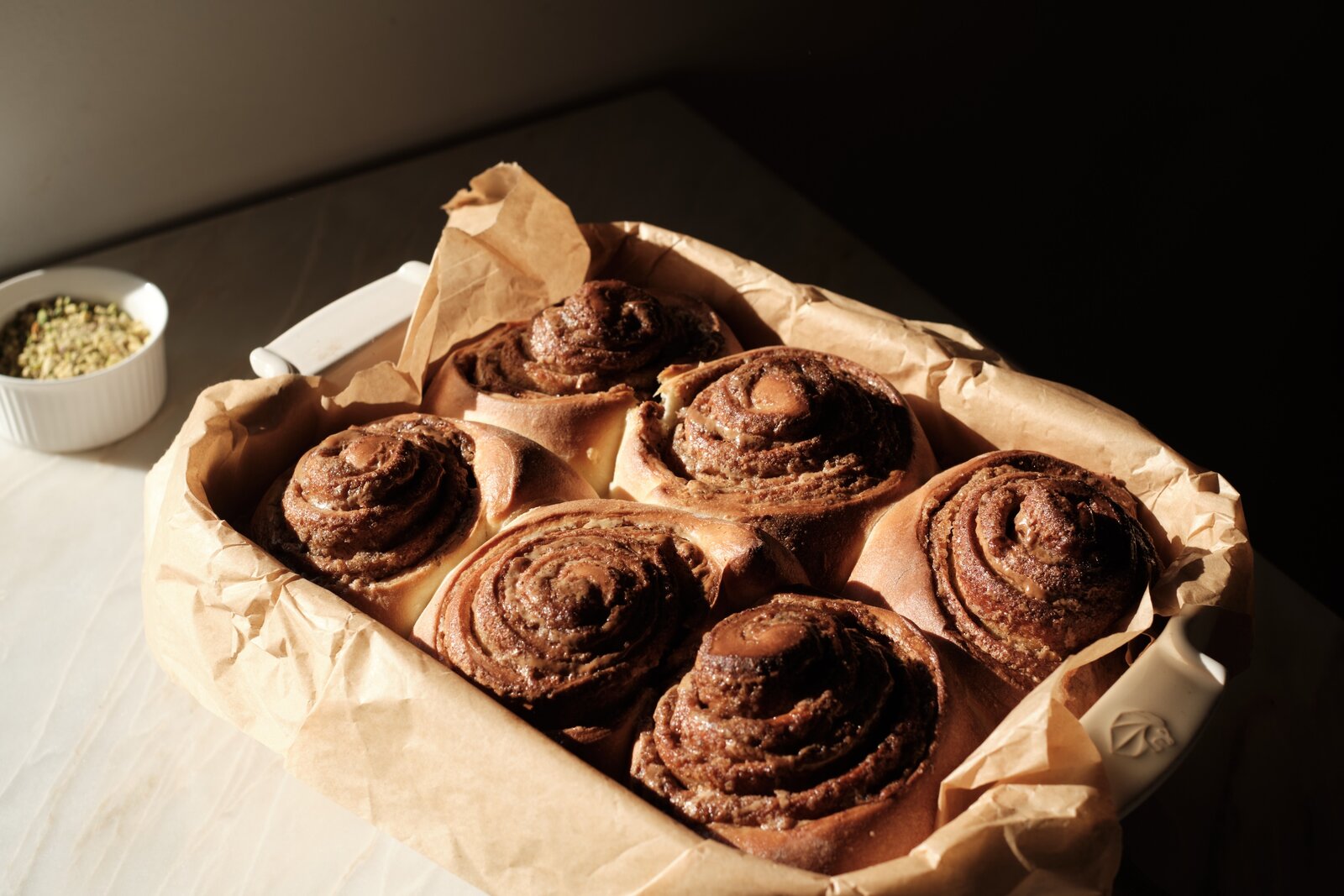 В этот уик-энд с 6 по 7 декабря на витрине будут представлены ароматные синнабоны с корицей и фисташковой пастой (590 руб.). Это уютная зимняя выпечка из сдобного теста с начинкой из сливочного крема с творожным сыром и сахарной пудрой, которым поливают ещё тёплые синнабоны из духовки, чтобы крем немного подтаял и сильнее пропитал выпечку, а сверху их посыпают рубленой фисташкой.