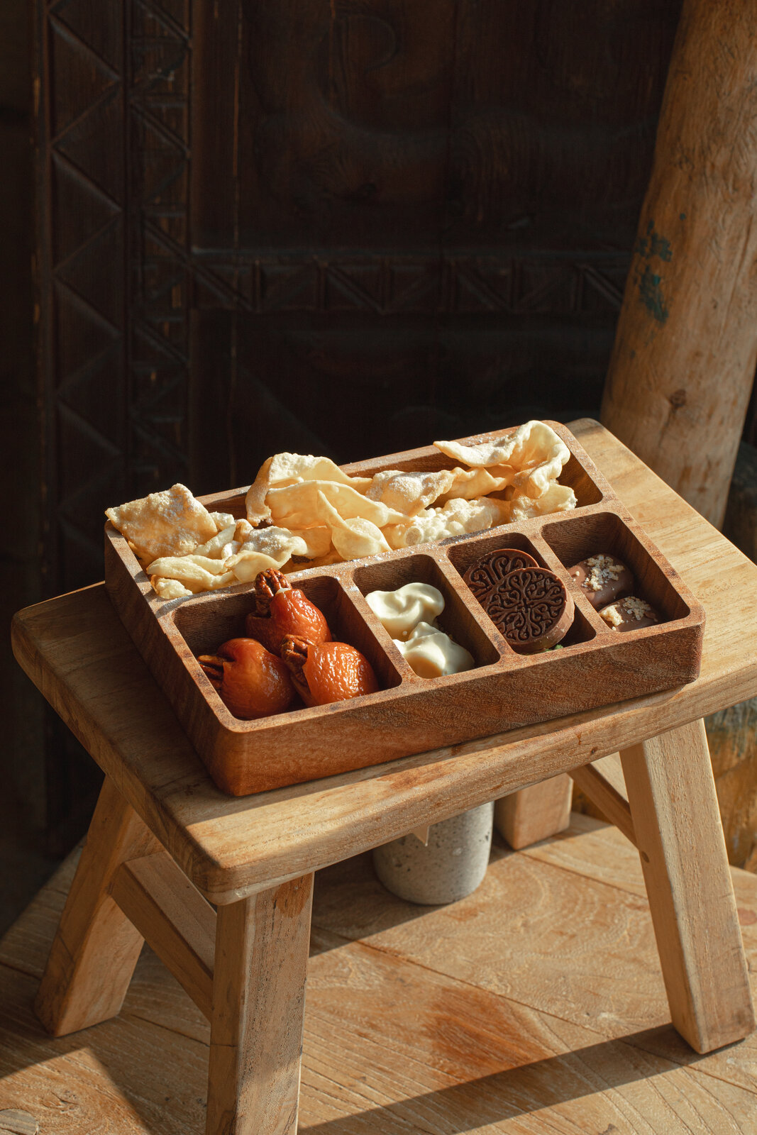 Завершит ужин поднос со сладостями: курагой, хворостом и тремя видами трюфеля (1250 руб.).