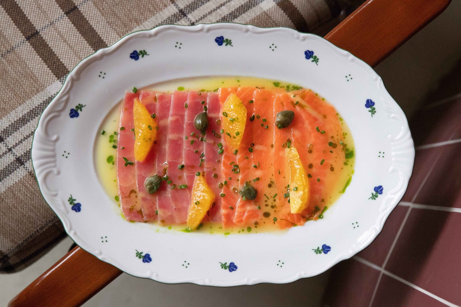 В меню: брускетты с ростбифом и трюфельным кремом (650 руб.), брускетты с разноцветными томатами и страчателлой (590 руб.), сырные пончетти с трюфельным кремом и пармезаном (690 руб.), дуо крудо из тунца и лосося (1090 руб.), маринованные перцы рамиро с анчоусами (590 руб.), салат нисуаз с подкопчённым тунцом (850 руб.), буррата с копчёными овощами (750 руб.), зелёный салат с креветками, пармезаном и миксом семян (950 руб.), пицца с форелью и страчателлой (1190 руб.).