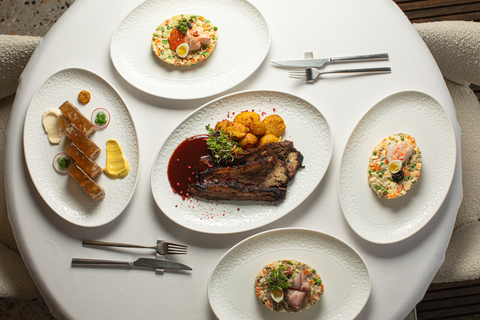 В меню: холодец из говядины (1200 руб.), оливье с копчёным лососем (1600 руб.), оливье с крабом (2800 руб.), оливье с брискетом (1200 руб.), брискет с мятым картофелем (2200 руб.), глинтвейн (750 руб.), пунш мандарин-малина (950 руб.), б/а глинтвейн (600 руб.) и матча «белый шоколад — кокос» (600 руб.).