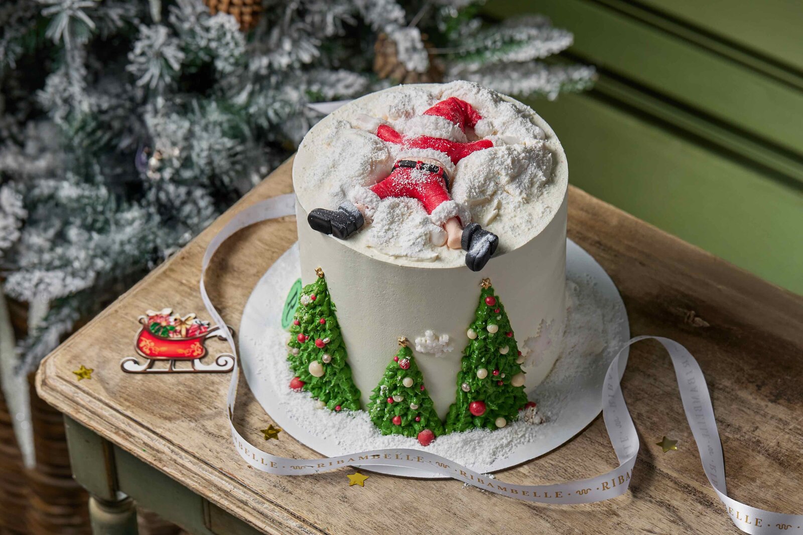 Команда кондитерской фабрики Ribambelle Cakes& Sweets подготовила эффектную коллекцию десертов, приуроченную к Новому году. Среди позиций есть пряничные домики с сюрпризом внутри, пряничные ёлки с шоколадными шишками, торты в виде телевизора с мультфильмом из детства и банки красной икры и торт «Дедопад» с отдыхающим в сугробе Дедом Морозом.