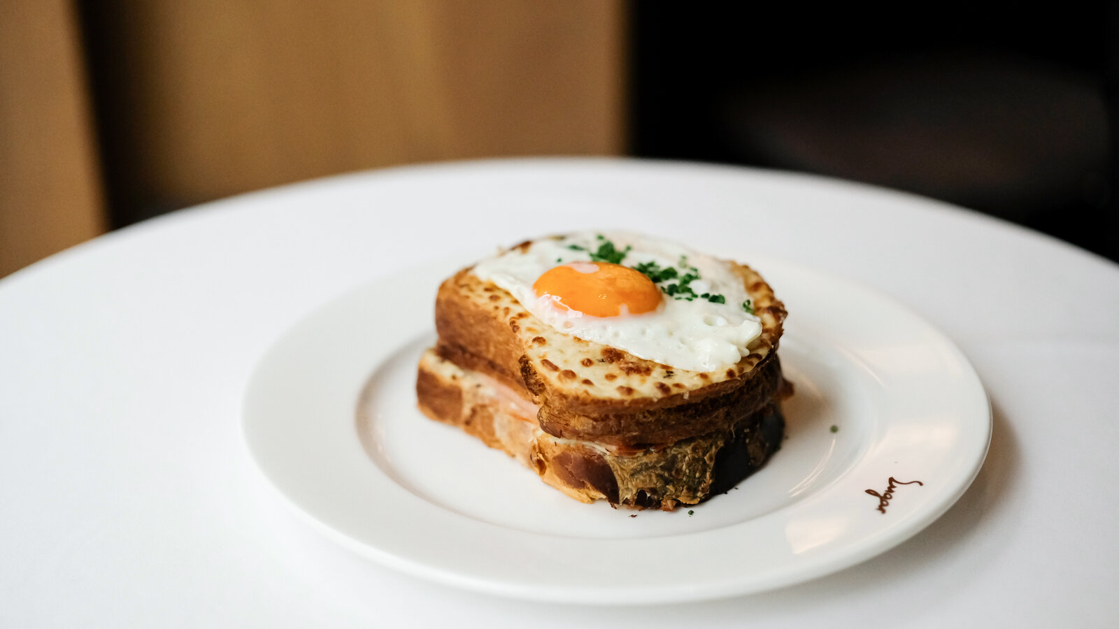Среди блюд: овсяная каша с конфитюром из чёрной смородины (650 руб.), бриошь со скрэмблом и осьминогом/креветками (1500/1200 руб.), крок-мадам с ветчиной из индейки (990 руб.), бифштекс на тартине (1390 руб.), зелёный салат с киноа и яйцом пашот (950 руб.), блинчики с соусом англез и малиной (950 руб.) и пан-пердю с соусом англез (850 руб.).