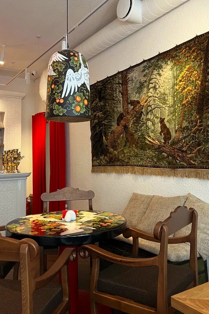 Всё пространство наполнено пасхалками, отсылающими гостей к промыслам Нижегородской области: окна украшены наличниками с городецкой резьбой, счётницы — казаковской филигранью, форма официантов — вышивкой в духе чкаловского гипюра. Меню поддерживает этот концепт и знакомит с блюдами и продуктами региона: хорошим рыбным воскресенским пирогом, волжской стерлядью с кабачком и кремом из капусты, поветлужской ухой из трёх видов рыб и белыми грибами. Даже лимонный рулет на десерт вам подадут расписанным под хохлому.