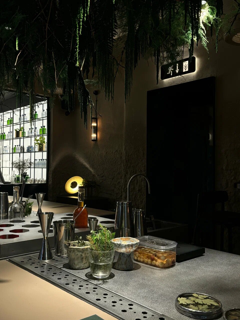 Ботанический бар в здании старинной усадьбы словно потайной мир, в который попадаешь через коридор — замочную скважину и оказываешься в укромном помещении, утопающем в зелени, со своей секретной лабораторией, где готовят дистилляты для коктейлей, и садом с изящной беседкой и грядками, на которых в сезон выращивают ягоды и травы для блюд и напитков.