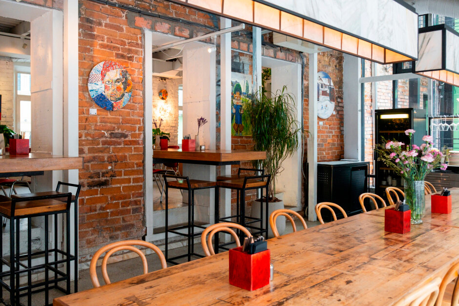 Пиццерия с девизом «Юлим, как хотим» и арт-галереей парой этажей выше осенью 2025-го праздновала своё восьмилетие. Отметили пробежкой, экскурсией, устричным баром и музыкой — и такая кипучая жизнь тут почти каждый день. Дресс-код был леопардовый — в честь подпалин от огня на бортиках пиццы: именно «Юла» научила Нижний любить трушные неаполитанские «Маргариту» и «Пепперони» из печи (а заодно и соусы к корочкам — от сливочного песто до цитрус-чили). Топингов под 20 видов — классика, авторские и десертные вроде черники со страчателлой, плюс компактное меню итальянской кухни, оранжи, гимлеты и вернисажи художников: арт, вино, коктейли — всё передовое.