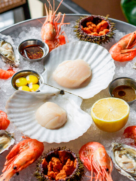 Сети под потолком, кораллы на столах, медузы из проектора, плато «Калипсо» и «Одиссей» с устрицами, крабами и гребешками: «Кусто» для дальней экспедиции укомплектован полностью. Меню ресторана Berezka Group (Franky, Negroni и др.) — атлас моллюсков и промысловых рыб, косяком идущих через тартары, хе и севиче, в суши, роллы и пасту, на лепёшки и гриль. В судовом журнале, то есть меню: тунец «в огне», уха на ольхе, из печени трески — пате с грушей в порто и попкорном из кедровых орешков. Кажется, на вахту заступили даже не океанологи, а поэты: в винной карте лирика от сомелье — «соль и мел», «полевой сбор», «великий и ужасный», а десерты стилизуют под жемчуг и ракушки.