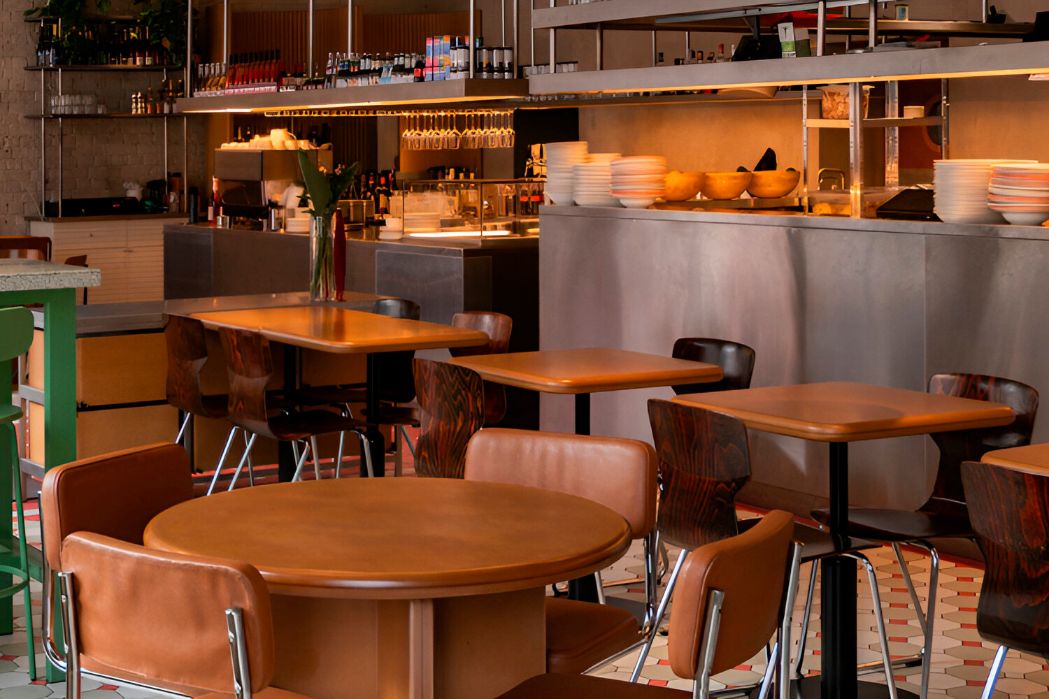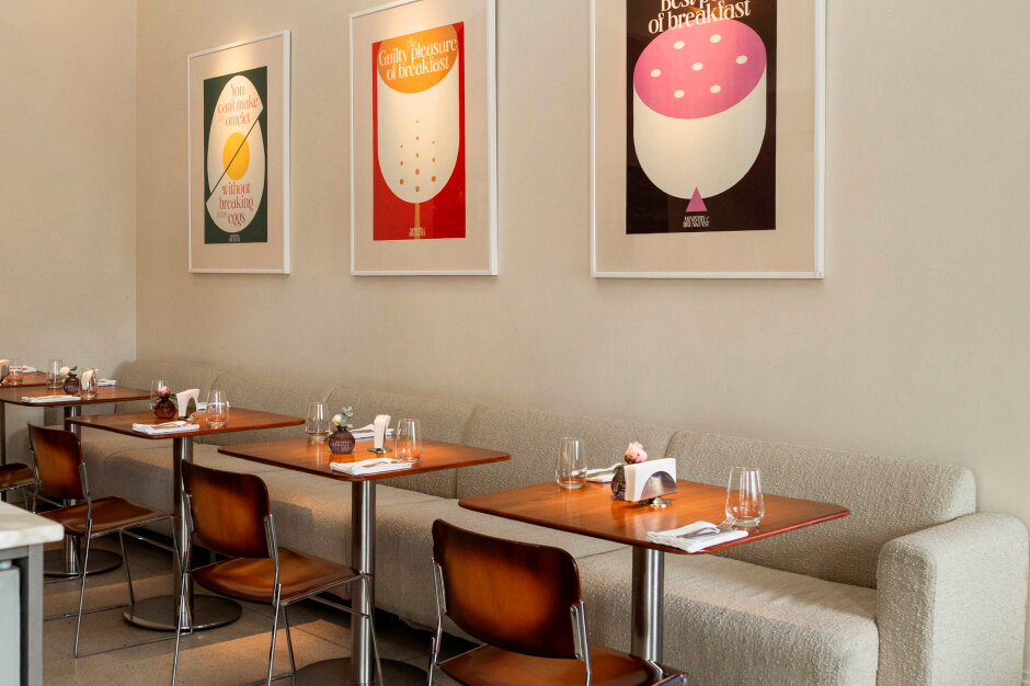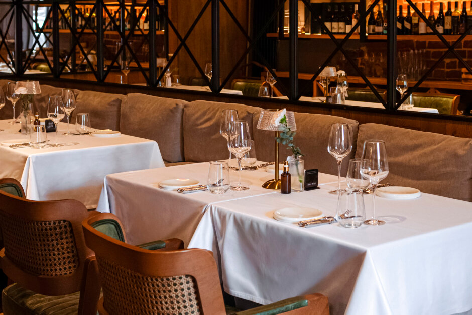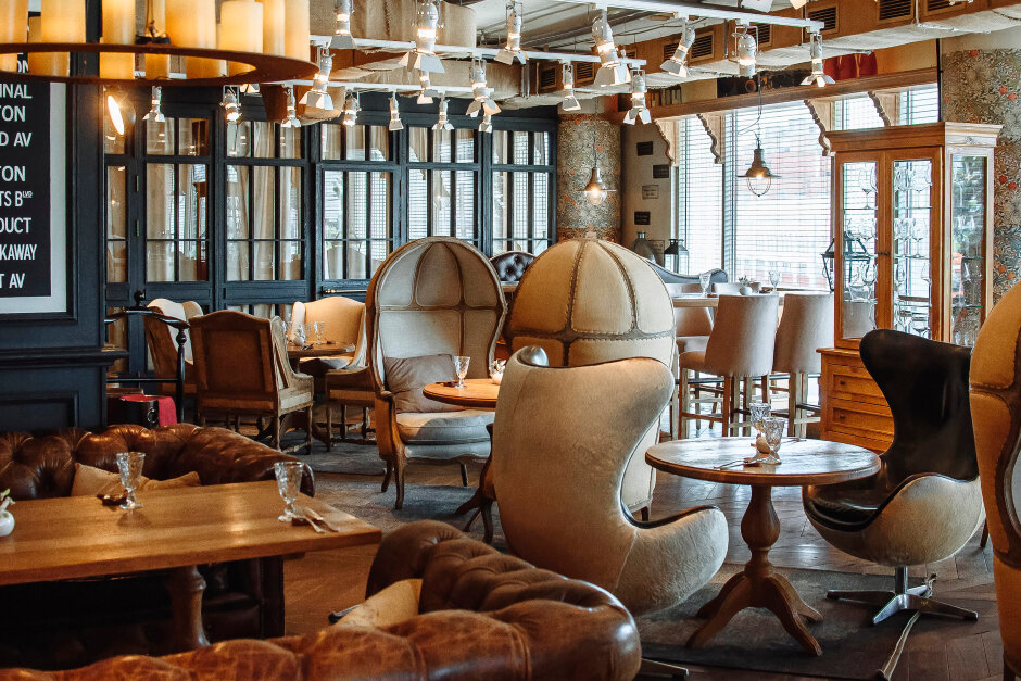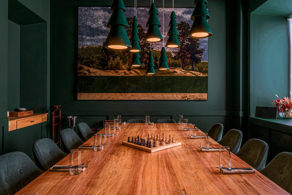 Это «министерство» — оргструктура явно из кэрролловского Зазеркалья. Шахматная клетка как лейтмотив дизайна, на метрдотелях жилеты будто с Мартовского зайца, сюр на фото в соцсетях а-ля кампейн Энни Лейбовиц с Алисой-Водяновой — и балы устраивают, где косплеят Страну чудес уже буквально. Навигацию по винной карте не иначе как доверили Чеширскому коту: оранжи «На заседании с мезгой», Сицилия и Тенерифе — это «Что-то на вулканическом». В меню до 16:00 «Приём у Бенедикта» (яйца с крабом или мортаделлой) и «Департамент бутерброда» (авокадо-тост, вафля с беконом и панкейки со стрипсами) плюс завтрак-конструктор, после — крокеты, шницель и ризотто; английский и континентальный завтраки весь день.