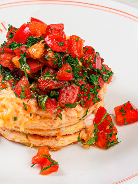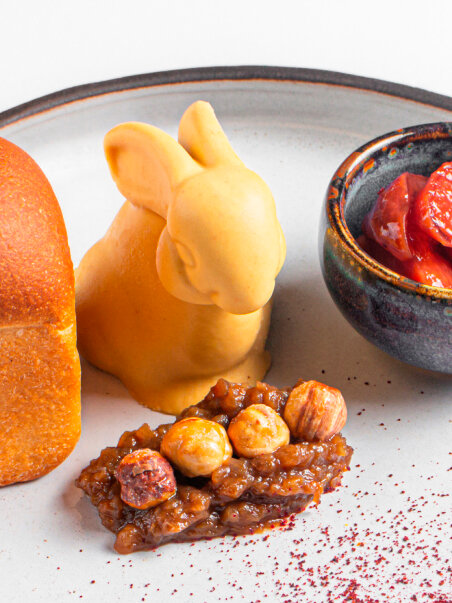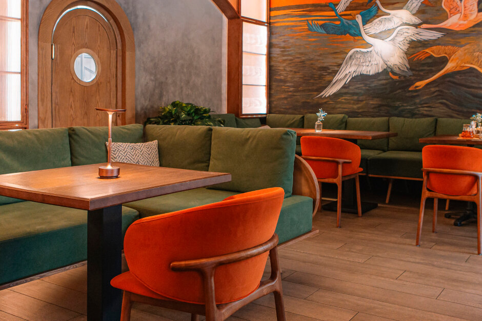 Турпоток в НиНо такой, что на «Ласточку» билетов не достать — запросы пикового трафика готов обработать «Гусь» на «Скобе» (неофициальное название здания торгового дома XIX века). Саммаризировали все нарративы: стена под балахнинское кружево, гуси-лебеди несут по небу ладью с яблоками — этот визуал генерили с ИИ, с ним же иллюстрировали коктейли от бара «Медные трубы», сидр произвели другие локалы, сидрерия «Ла Фуар». В меню местные кулинарные легенды, от шаляпинского паштета до цветаевского пирога, но вавилонскому столпотворению гостей ведь не только Русь подавай, так что кухня здесь как Нижегородская ярмарка, куда съезжались отовсюду: готовят всё — от эчпочмаков до люля и пасты.