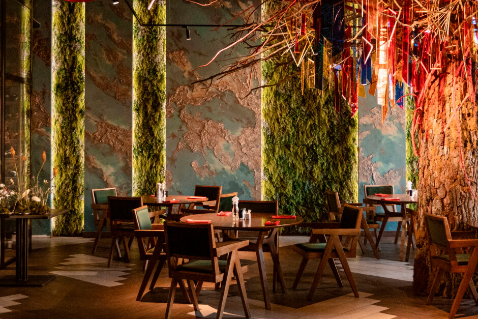 Гастрономическая мультивселенная ресторана Ribs за основу своего мироустройства взяла вау-эффект. Площадь в 1000 м², четыре зала — главный на сто человек и для частных мероприятий, деревья под потолок, кресла в меху почти до пола, аквариум с сифудом, ужины в формате chef’s table, концерты и вечеринки. Винная карта и меню — планетарного масштаба: пицца, паста, форшмак, том ям, бургер — и повсюду значки, обозначающие шоу-подачу. Рёбра (свиные, лося, оленя, марала и так далее) прикатят на тележке в клубах жидкого азота, коктейли окуривают и поджигают, на десерт — сердце из мусса каркаде в «стеклянной» глазури внутри грудной клетки из меренги.