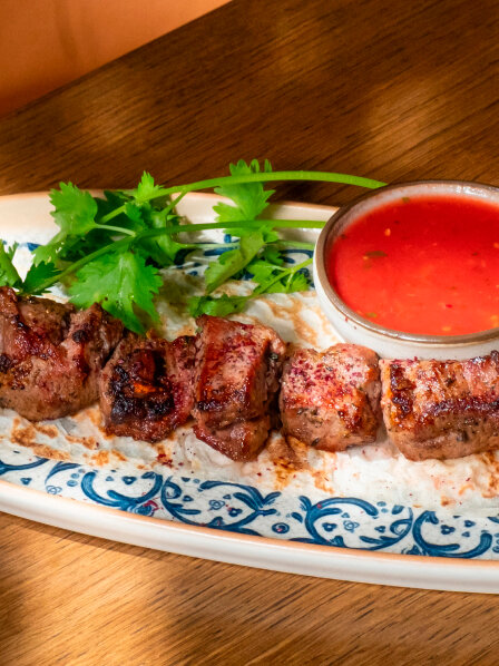 Солидный мясной ресторан неподалёку от Кремля парадной локации соответствует: пятизвёздочный сервис, официанты в белых перчатках, терраса на крыше и детская комната с бебиситтером, ужины с вагю и «императорские вечера» с дегустацией шампанского гранд-домов. У винной карты особые дипотношения с Италией: из шато в Тоскане привозят своё вино и публикуют видеоотчёты, а красный бленд посвятили Максиму Горькому на Капри, где он писал, между прочим, «Русские сказки» и «Мать». В меню образцовые стейки, рёбрышки и брискет (его же кладут в бургер и чебуреки) из смокера, перепела с полбой, шашлык из окской стерляди, из оленины — вырезка с брусничным жу, карпаччо, тартар и строганина.