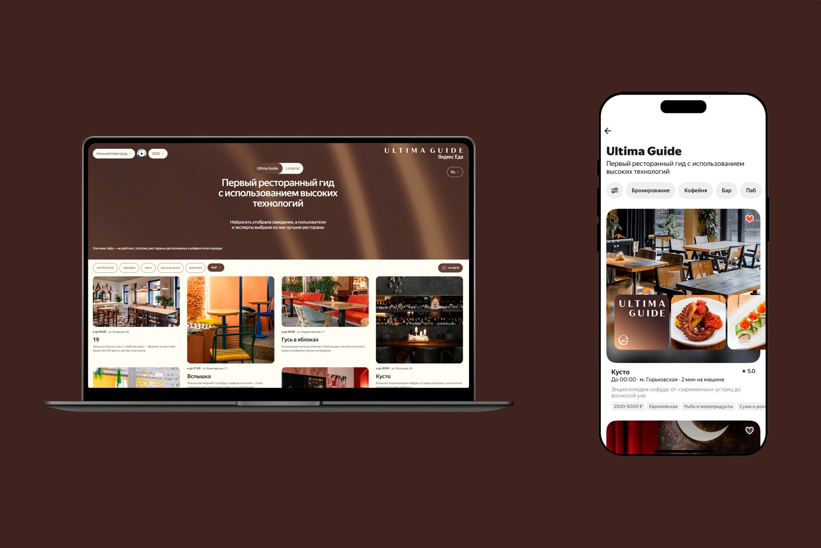Ultima Guide — первый ресторанный гид от сервиса Яндекс Еда, созданный с использованием высоких технологий. В каждом городе присутствия путеводителя Еда сначала анализирует тысячи ресторанов с помощью ИИ — оценивает по количеству заказов и посещений, отзывам в приложении Яндекс Карт и ещё более чем 100 критериям — и формирует лонг-лист из претендентов. Затем локальные эксперты и пользователи голосуют за лучшие из них.