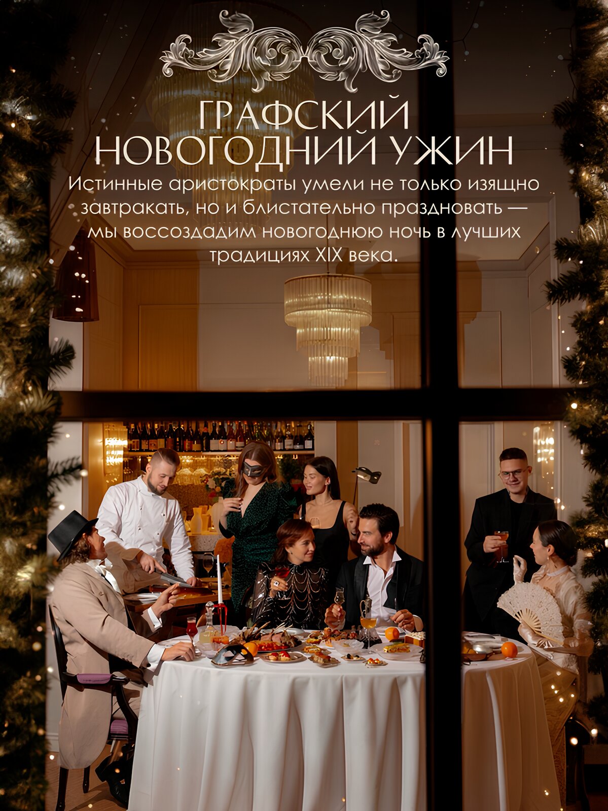В новогоднюю ночь бар превратится в камерный салон XIX века. Обещают стильную и ненавязчивую развлекательную программу «В гостях у Графа» с ведущим, диджеем и выступлением артистов, поздравлением и подарками от Деда Мороза и Снегурочки. На столах — уникальный новогодний сет от шефа Ильи Харченко и авторские коктейли от шеф-бармена Даниила Лемана.