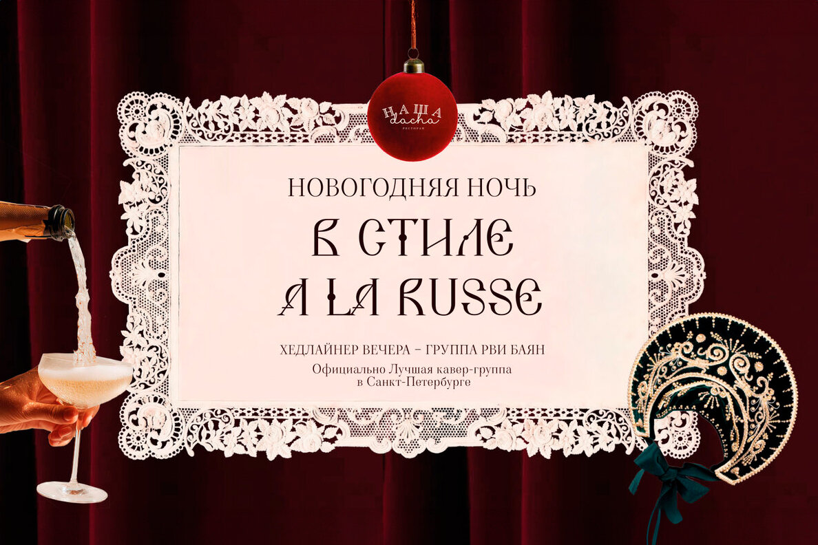 В исторической усадьбе на берегу Финского залива будет царить атмосфера в стиле «А-ля рус». В программе ночи: новогоднее меню от бренд-шефа, живая музыка от кавер-группы «Рви Баян», ведущий, DJ-сет, Дед Мороз и Снегурочка, розыгрыш подарков и анимационная программа для детей. Дресс-код с русскими народными акцентами приветствуется.