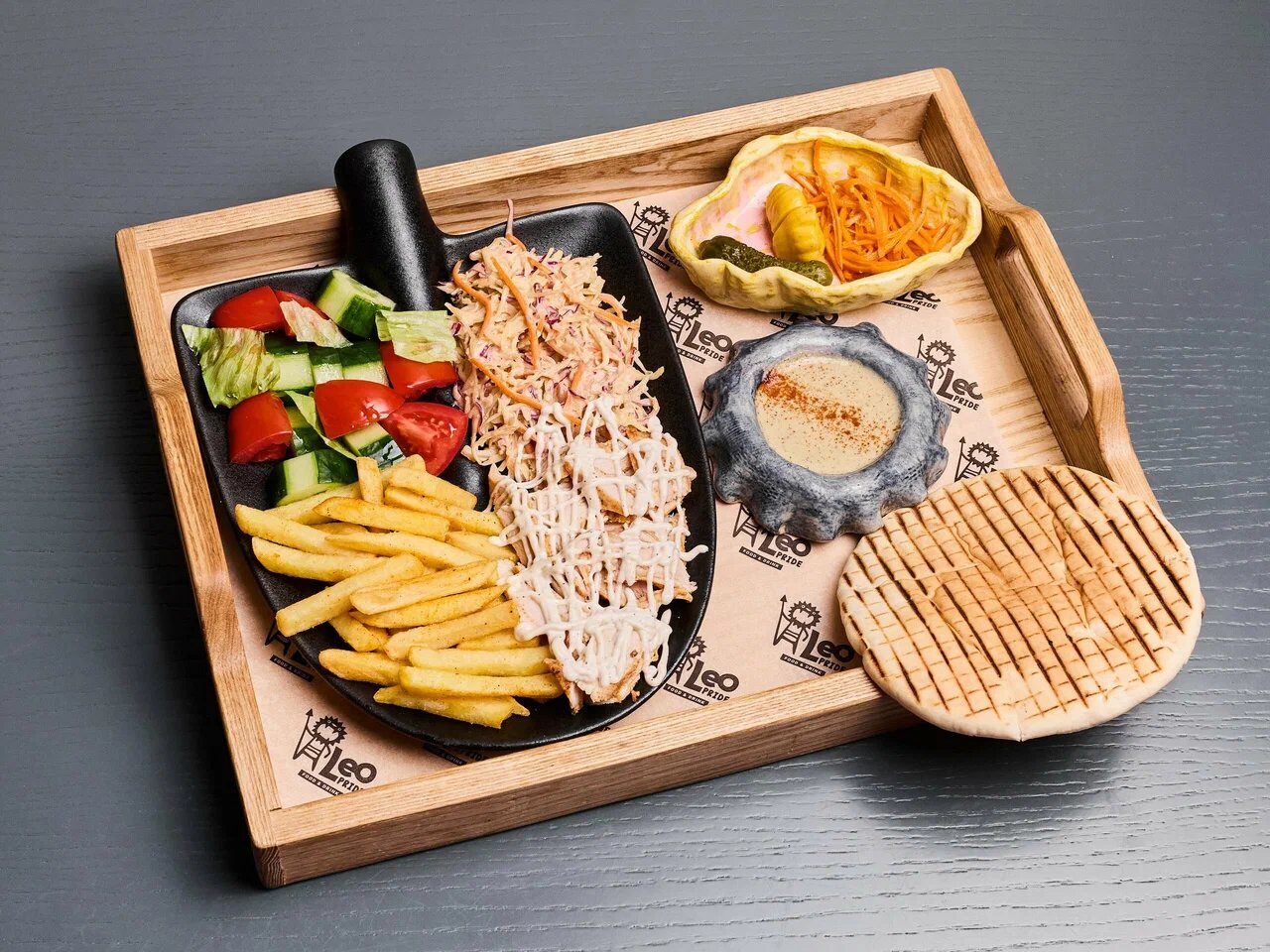 Шаверма-бар предлагает уютное пространство, где можно отведать множество вариантов питерского стритфуда (в среднем по 400 руб.), его здесь подают даже на лопате. Кроме этого, в меню можно встретить салаты и закуски в азиатском стиле, супы и десерты, а в качестве напитков можно выбрать фирменные лимонады, кофе и даже вино.