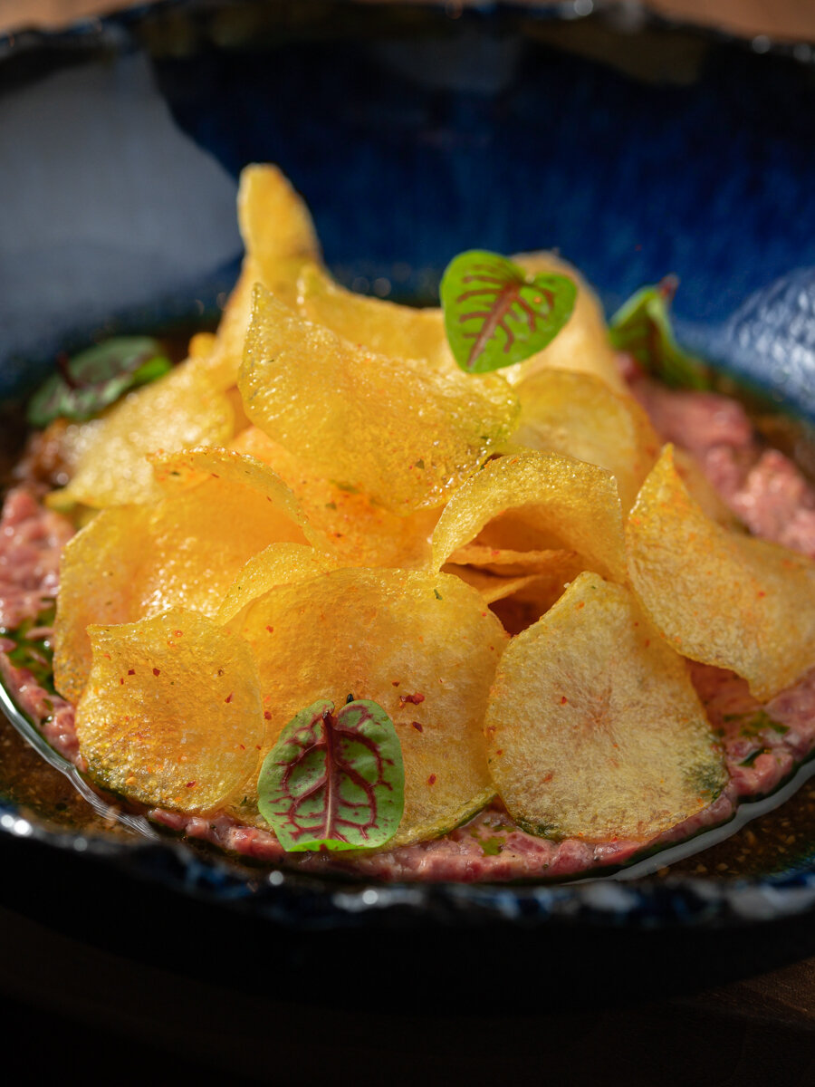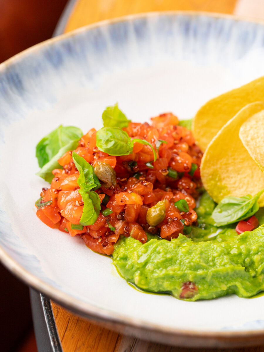 Тартар из форели с гуакамоле и картофельными чипсами;