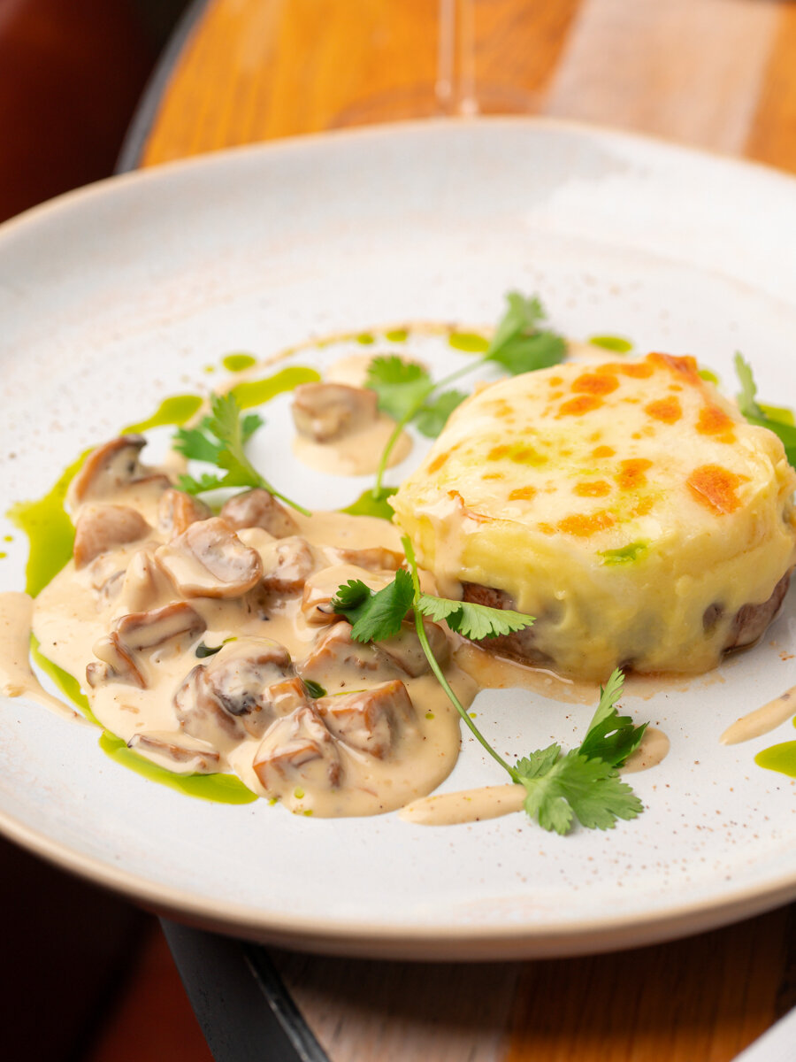 Медальоны на гриле с картофельной запеканкой и грибным соусом.