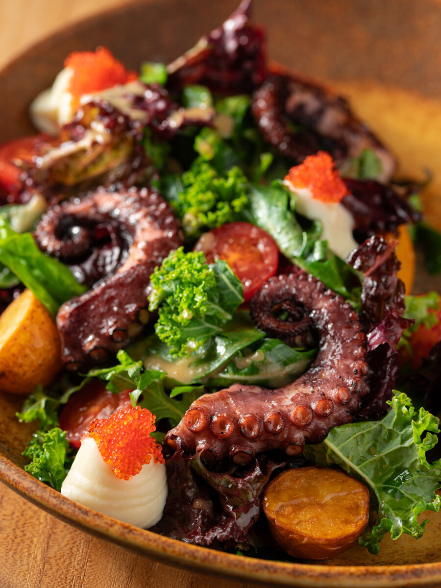 Салат с осьминогом, бейби-картофелем и апельсиновым дрессингом;
