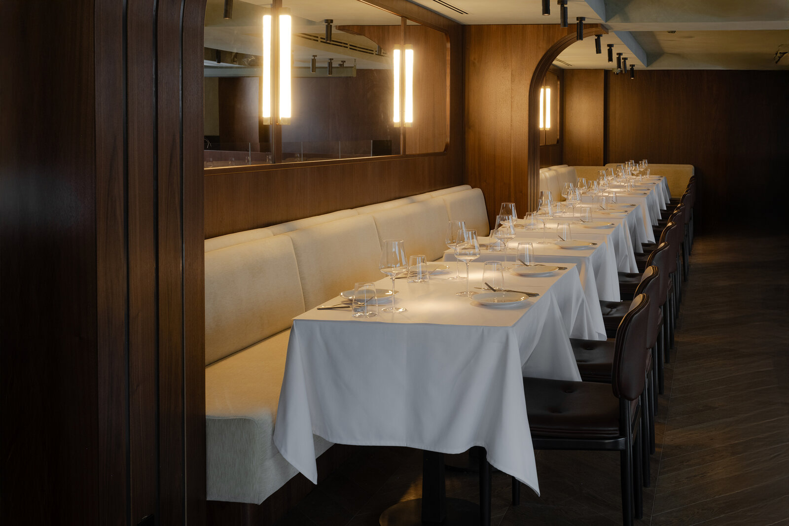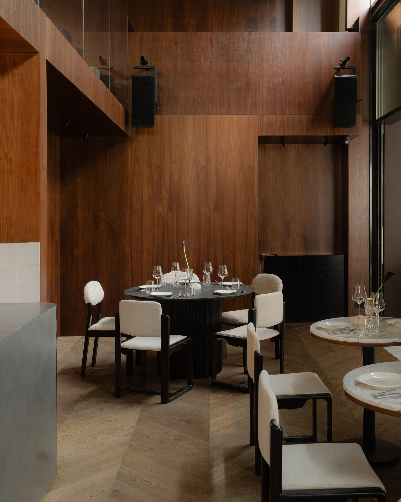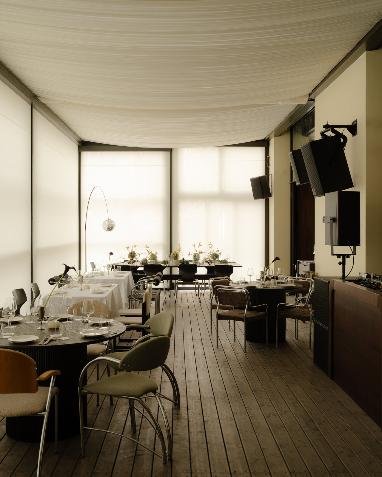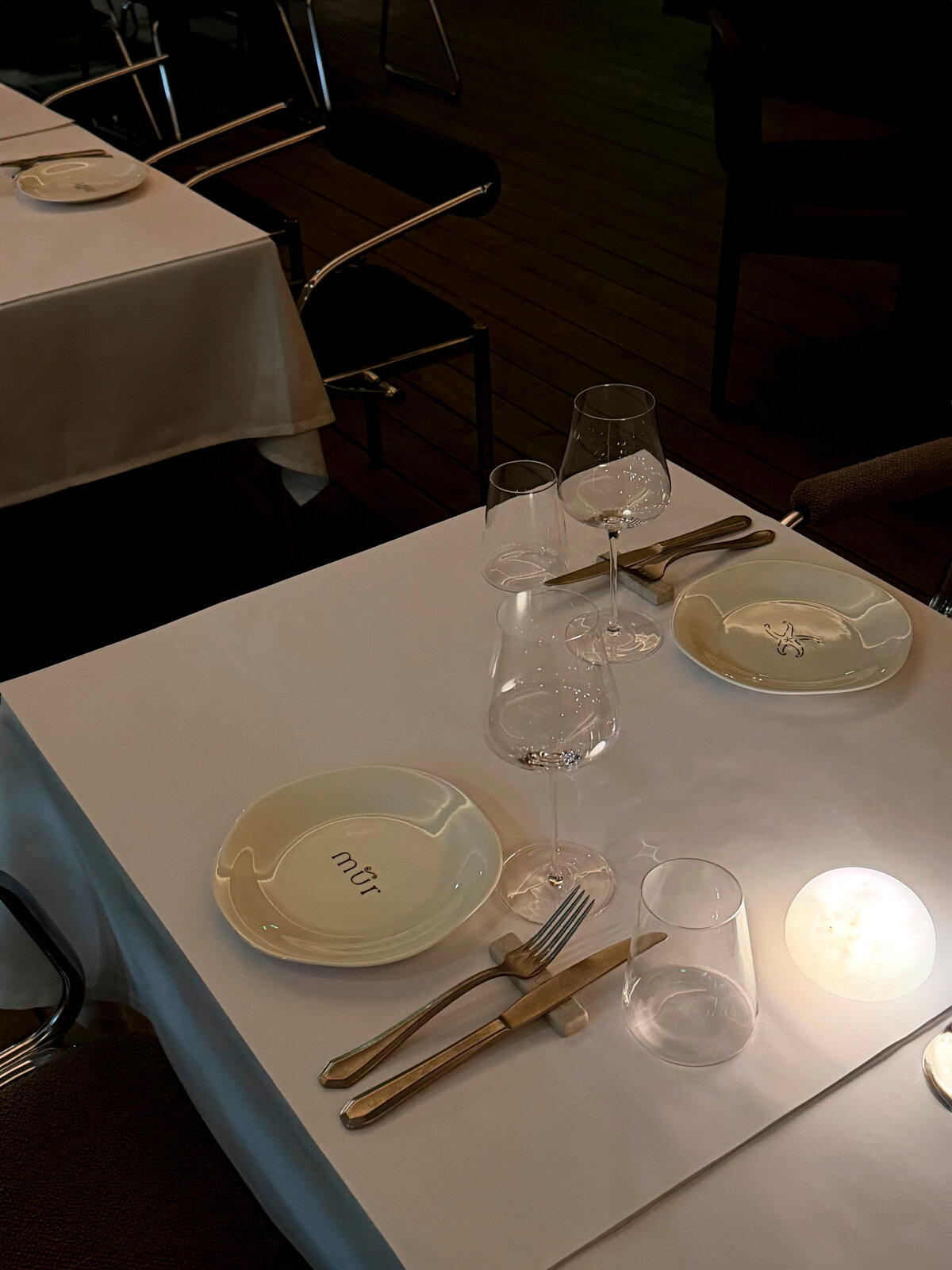 Главный цвет mür — белый: это скатерти, посуда, тканевое полотно под потолком, явно намекающее на паруса. Его оттеняет благородное тёмное дерево, и другого декора здесь практически нет. Строгость разбавляет посуда с морскими иллюстрациями и лаконичные цветы на столах, но в целом вечерняя атмосфера скорее сдержанная и притягательная. Хотя уверена, всё будет иначе, стоит только появиться диджею за пультом — ночной формат работы, как мы знаем по Soma, команде особенно удаётся.